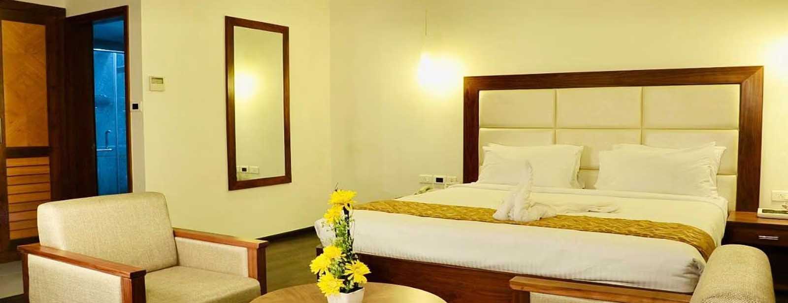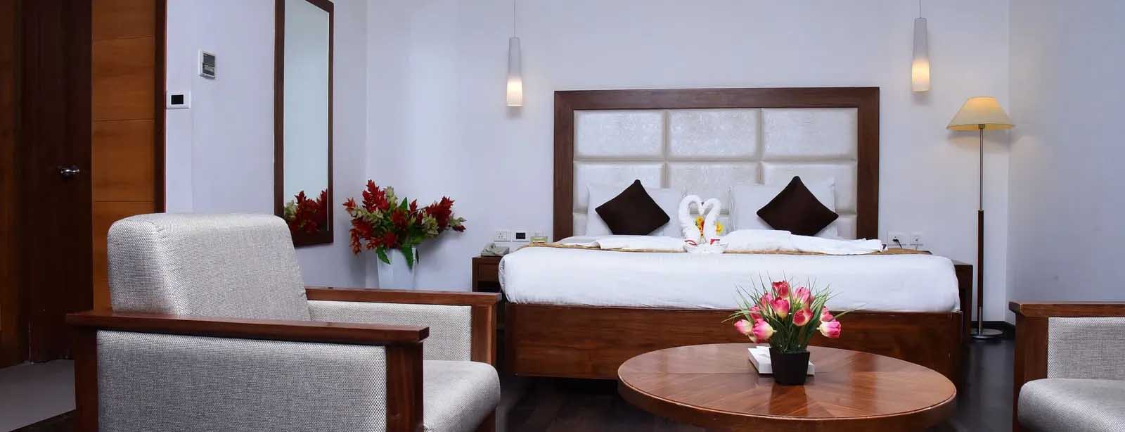 A step into comfort, our Suite is designed for guests who appreciate thoughtful design and spacious living. Spanning 558 sq. ft., this elegant suite accommodates up to four guests and features a separate living area and two private bathrooms, ensuring convenience and privacy. With only eight suites available, thoughtful amenities like a smoke alarm and turndown service enhance the experience, making every stay seamless. Whether for business or leisure, our suites near Perambalur bus stop offer a refined escape with added comfort.